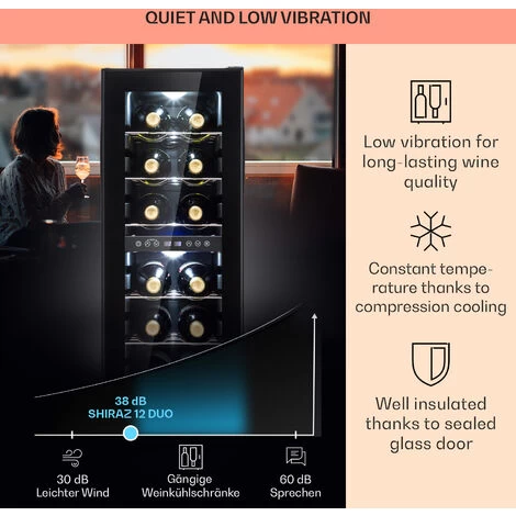 Experience the highest level of wine enjoyment with the Klarstein Shiraz 29 Duo wine refrigerator. With its two separate cooling zones, it gives both red and white wines the right drinking temperature at the same time. Thanks to the panoramic glass door and the LED interior lighting, you can keep a perfect view of the luxurious ambience and the up to 29 bottles at all times. Thanks to the convenient touch control as well as its elegant exterior, the Shiraz 29 Duo enriches every living ambience with comfort and elegance.