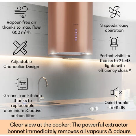 The external appearance of the Klarstein Beretta island extractor hood is absolutely elegant. The round copper-coloured housing made of stainless steel effortlessly gives your cooking island a stylish and luxurious shine.
