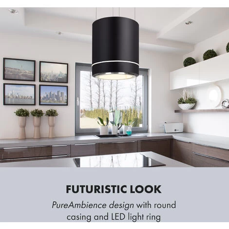 The appearance of the Klarstein Tron Ambience island hood is absolutely elegant. In the PureAmbience design, the round black housing with its bright LED ring lends a futuristic shine to the cooking island.
